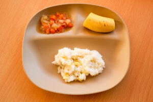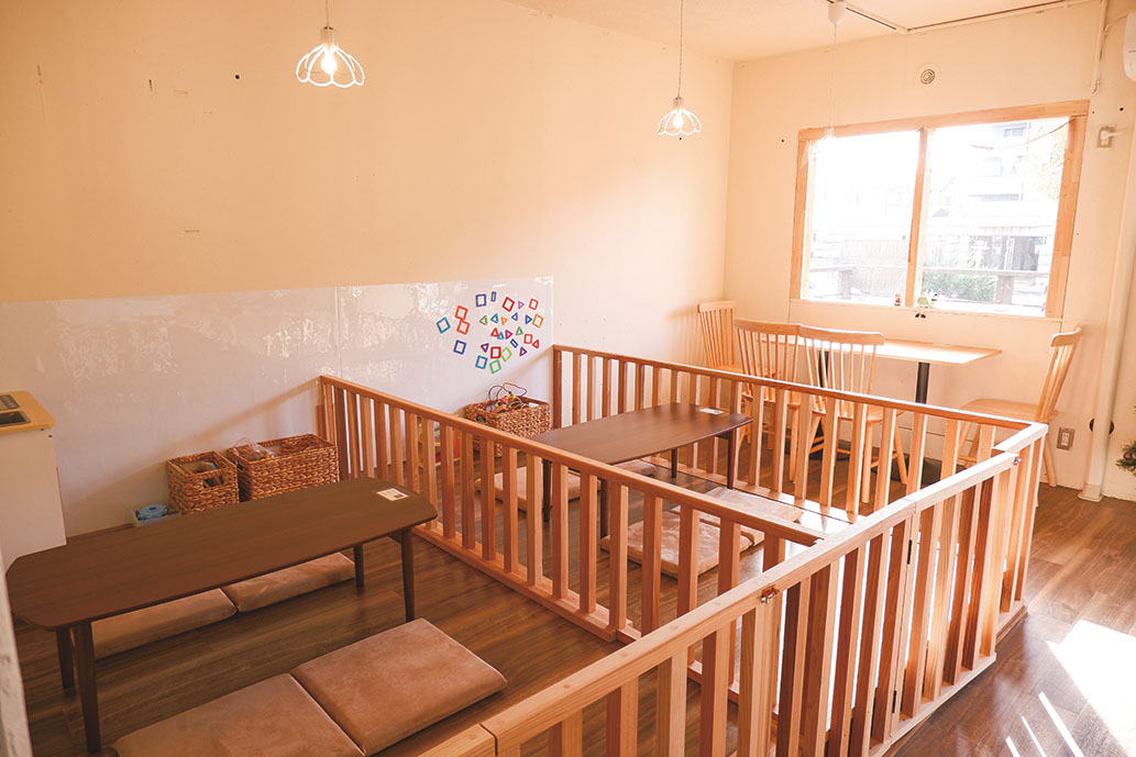 柵で仕切られた座敷席に、各年齢向けおもちゃ、授乳&おむつ替えスペースも完備と、赤ちゃん・子ども連れ大歓迎のカフェ。子育て中で、保育士経験もあるオーナーの“あったらいいな”を盛り込んでいるから、子育てママの“かゆいところに手が届く”サービスが満載です。同建物にある「aripan」のパンを使った、終日食べられるモーニング(400円~)や、日替わりランチ(1300円)、キーマカレーか焼きカレーを選べる「カレーランチ」(写真・ドリンク付き1100円)、ケーキ&各種ドリンクなど大人向けメニューのほか、3大アレルゲンフリーを含むキッズ用ご飯(500円~)、中期・後期が選べる「離乳食」(500円)も用意。食べ慣れたパウチ型離乳食の持ち込みもOK。「お母さんの負担を軽くしたい」との願いが随所に。