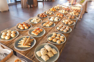 まず圧倒されるのは、彩り豊かなサラダビュッフェと、ずらりと並ぶ約30種ものパン。食事系からスイーツ系まで大満足のラインアップで、目移りすること必至です。ランチは、スープとパン(またはサラダ)の組み合わせ(1380円)から、さらにデザートとドリンク付きで、肉料理かパスタ2種からメインが選べるメニュー(3800円)まで5コース。「ティラミス」(950円)は追加注文もOK。ソフトドリンクやお酒もあり、家族や女子会などのカジュアル利用から、特別な会食まで幅広く利用できます。ディナーは、メイン2種+スープ&ビュッフェ(6600円)を用意、デザートは街のきらめく夜景を望む別室で優雅に。土日は予約がスムーズ。