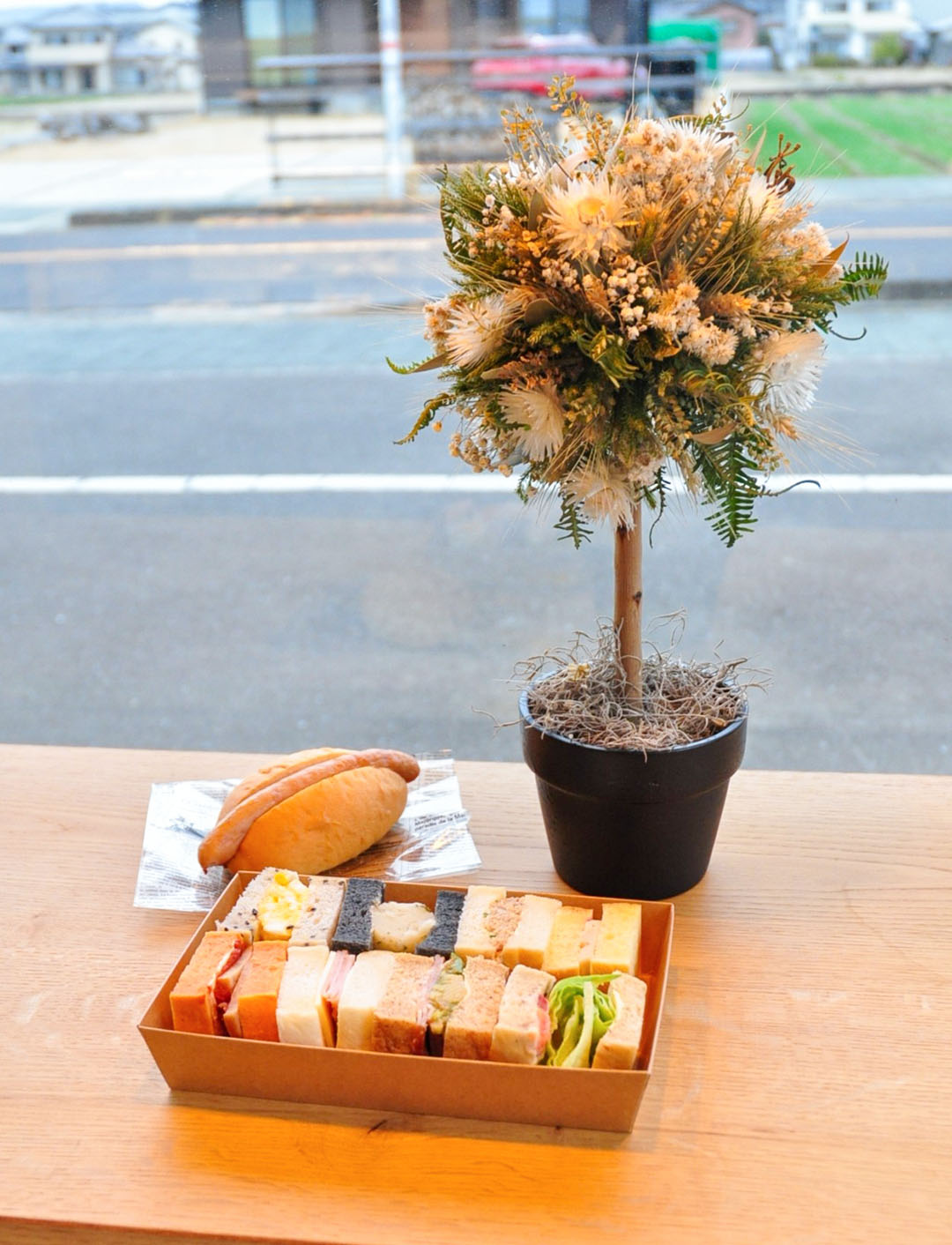 IT企業に30年勤めた店主が15歳からの夢をかなえたお店。サンドイッチは、サラダ・肉・スイーツ系とコース料理をイメージした「カクテルiiSANDオール8」(8個入り780円)や具材がより豪華な「カクテルiiSANDプレミア」(1180円)など6種類。小ぶりだから少しずつ多彩な味を楽しめます。8種あるパンは、大阪の有名ホテル出身のベーカリーシェフ・米澤孝一氏が監修。ヘルシーな「五穀パン」や「胚芽パン」、程よい酸味の「トマトパン」、リッチな味わいの「生クリームパン」などそれぞれにこだわりアリ。低温調理したローストチキンなど具材も妥協なし。「カレーソーセージ」(360円)と「みるくサンド」(240円)は常温OK。今里町のコードコーヒーが同店用にブレンドしたコーヒーもぜひお供に。イベントやパーティー用の予約も受け付け。