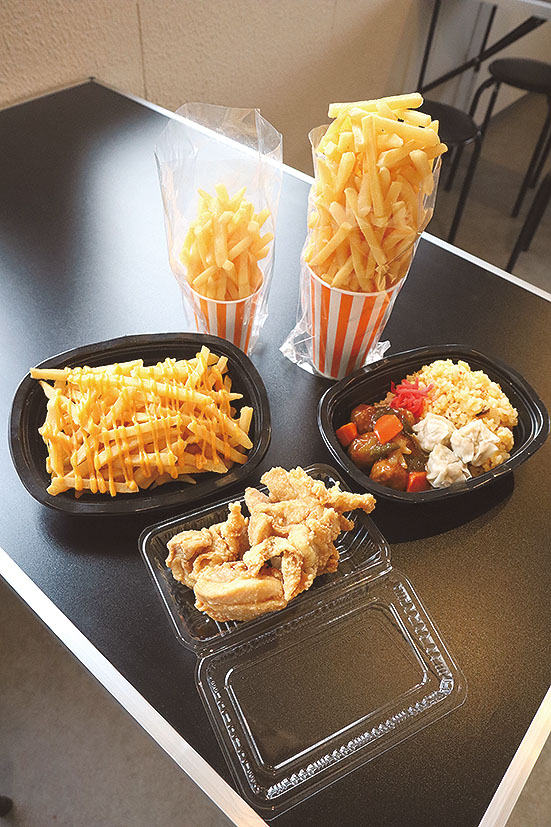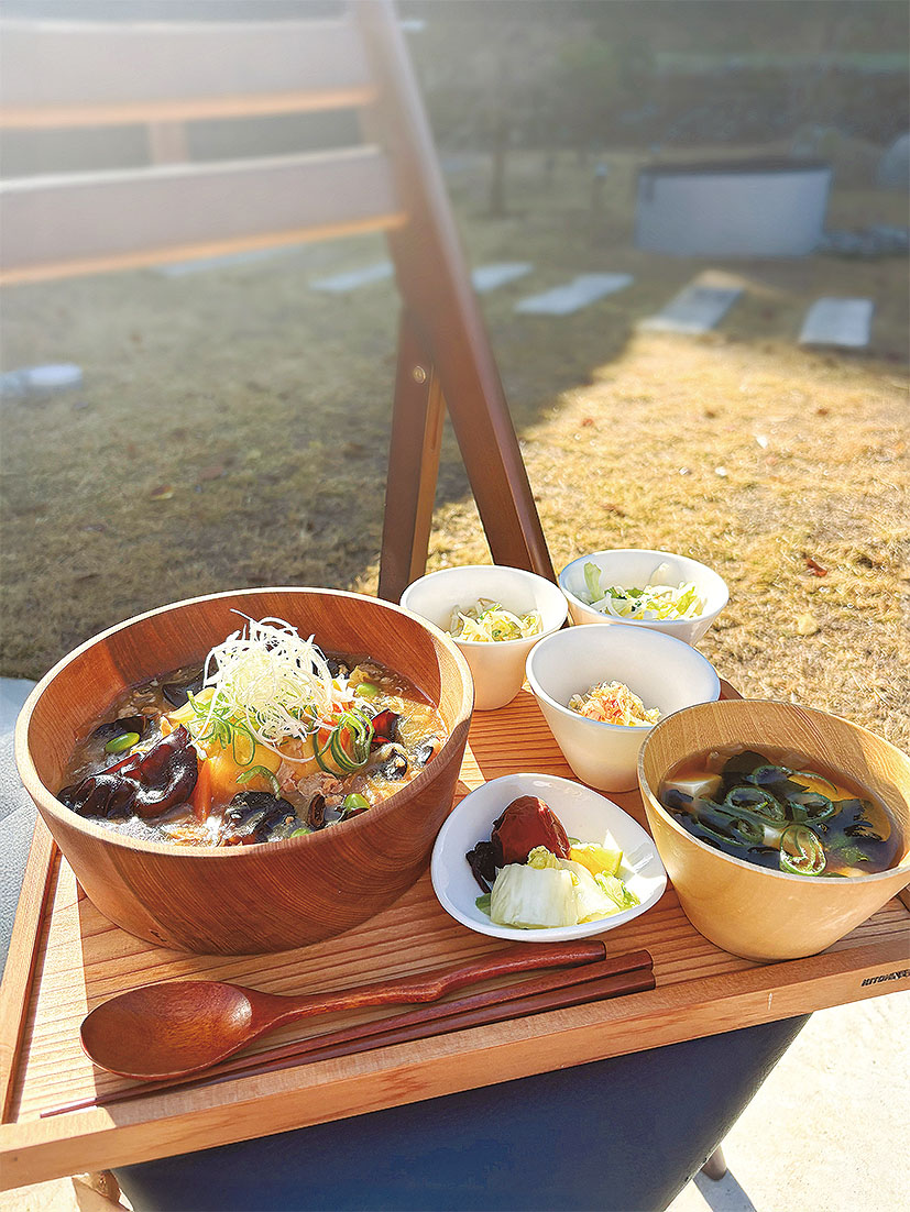 未利用魚や規格外の野菜をなるべく使用。魚のあらやかつお節で取っただしが風味豊かなたこ焼きは、大ぶりで外はカリッと、中はとろっと焼かれ大満足の食べ応え。日替わりでタコ以外の変わり種も(取材時はアスパラ!)。夜はセルフで焼きながら楽しめます。ランチ(1200円)は、タコ焼き4個と未利用魚のフライ、選べる総菜4種、ご飯とスープ付き。
